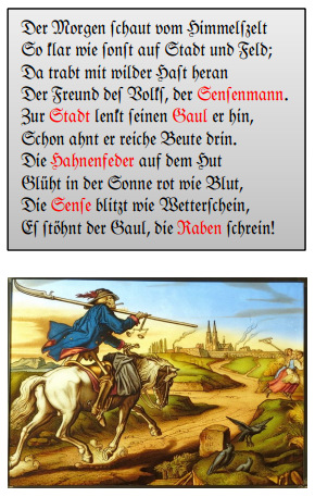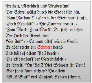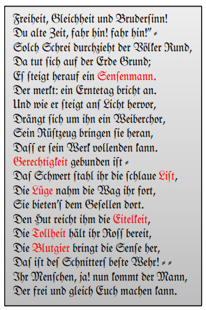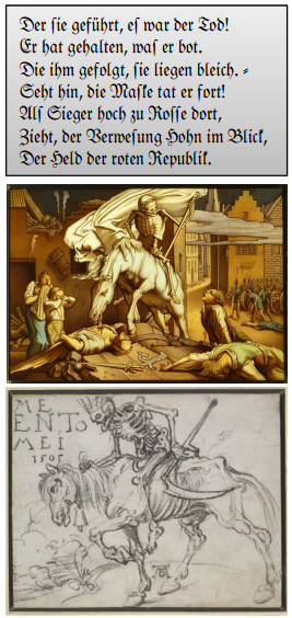 [11] Noch martialischer ist das Vorwort zum Großen Lied: „Horcht auf, ihr Fürsten ! Du Volk, horch auf ! / Freiheit und Rach' in vollem Lauf, / Gottes Wetter ziehen blutig herauf! / Auf, dass in Weltbrands Stunden / Ihr nicht schlafend werdet gefunden ! / Reiss' aus dem Schlummer dich, träges Gewürme / Am Himmel, schau auf, in Gewitterspracht / Hell Hell aufgegangen dein Todesgestirne ! / Es erwacht, / Es erwacht, / Tief aus der sonnenschwangern Nacht / In blutflammender Morgen wonne, / Der Sonnen Sonne / Die volkesmacht! / Spruch des Hernn, du bist gesprochen, / Volkesblut, Freiheits blut, du wirst gerochen / Götzendämmrung, du bist angebrochen.“ Man könnte Alfred Rethels Bild-Zyklus als direkt Antwort auf diese Verse verstehen.
