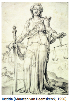 Das erste Blatt führt in das Thema ein: ein Skelett erwacht und steigt aus einem ursprünglich mit einem Kreuz geschmückten Grab und wird nun von fünf krähenfüssigen Frauen als personifizierter Tod in Gestalt des Sensenmanns ausstaffiert. Der entmächtigten und gebundenen Justitia, unter der die Weltordnung zusammenzustürzen scheint, werden die Attribute entwendet und dem Skelett übergeben. Die personifizierte List mit einer Schlange als Halskette überreicht ihm das Schwert und die Lüge mit einer Maske vorm Gesicht die Waage. Beide verweisen dabei auf die ohnmächtige Justitia.