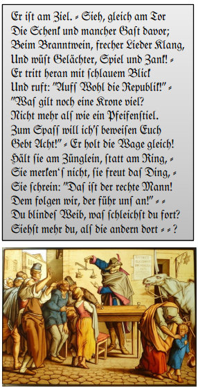 Der Tod führt den Zuschauenden nun einen Trick vor, bei dem eine Krone so viel Wert ist (so viel wiegt) wie eine Pfeife (auch dies ein gängiges Revolutionssymbol). Das gelingt nur, indem er die Waage bewusst falsch anfasst. Daraufhin wird der Tod von den Dabeistehenden zum Führer des Aufstands erwählt.