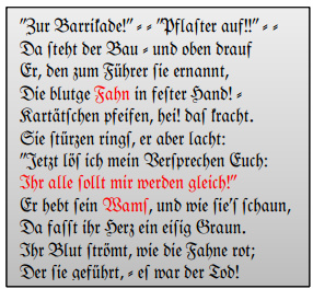 Aber auch zeitgenössisches revolutionäres Liedgut könnte hier aufgegriffen sein, wie etwa das folgende, 1815 von Karl Follen gedichtete große Lied, das nach der Melodie von „Heil dir im Siegerkranz“ gesungen wird:[11]