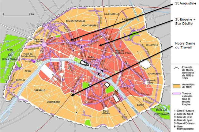 Auf dem oben abgebildeten Plan von der Haussmannisierung von Paris ist gut erkennbar, dass das 14. Arrondissement, in dem die nun zu betrachtende Kirche liegt, gerade erst im Entstehen begriffen ist.