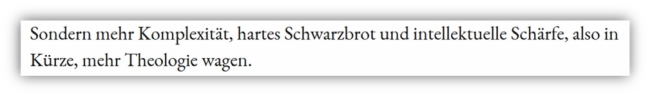 Worum es mir geht, ist, dass diejenigen die so reden, zum einen eine fixierte, ahistorische und aktuell auch unzutreffende Vorstellung von Schwarzbrot haben (harte Kost) und zum anderen eine merkwürdige Vorstellung von Theologie besitzen und nun beides miteinander verbinden. Theologie ist aber ebenfalls keine „harte Kost“, der sich heutige Pfarrer*innen nicht nähern wollen, weil sie die Zumutung scheuen. Sie sind nur mit anderem theologischem Brot großgeworden.