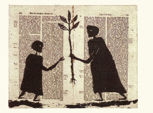 Bild 8 [10] Welche Rolle spielt der Hintergrund für die Übermalung? Die Werkangabe behauptet, dass es sich hierbei um 2 Bibelseiten handelt. Das mag sein, es handelt sich aber keinesfalls um einen biblischen Text, sondern um einen Kommentar oder um eine Einführung in den Propheten Sophonias bzw. Zephanja. Der Text scheint also für Genin nicht wichtig, sondern vielmehr das Blatt einer Bibel, eines alten heiligen Buches. Der Druck zeigt zwei Menschen, einen größeren und einen kleineren - wieder taucht die Frage auf, Vater und Sohn, Mutter und Tochter, Lehrerin und Schüler? Die größere Person überreicht der kleineren Person eine Pflanze, herausgerissen aus ihrer Umgebung, aber noch mit Wurzeln versehen. Sie kann überleben, sie kann weiter wachsen, sie kann sich noch vermehren - sie kann aber auch verdorren, weggeworfen werden. Sie wird so oder so behandelt. Sie ist Natur- und Kulturprodukt zugleich. Kultur kommt von agricultura - sie muss gepflegt, bewahrt, weiter gegeben werden. Sie muss aber auch ausgerissen werden, aussterben. Dem Akt der Traditionsvermittlung, der Kulturweitergabe wohnt immer etwas Hoffnungfrohes und Gewalttätiges zugleich inne. Wie steht es nun um den Hintergrund, der dem Künstler offensichtlich inhaltlich nicht wesentlich war? Der Prophet Zephanja verkündet den Tag des Herrn, den dies irae, Tag des Zorns, den Tag, der alle Kulturen aus ihrem Angestammtsein herausreißt, ja, sich sogar gegen das eigene Volk, das gottlos gewordene Jerusalem richtet. Doch es bleibt eine Verheißung in Zeph 3,12: "Ich will in dir übrig lassen ein armes und geringes Volk: die werden auf des Herrn Namen trauen." (Luther 1984) Oder nach der Bibelübersetzung in gerechter Sprache 2006: "Ich werde in deiner Mitte ein Volk übrig lassen, das arm und schwach ist, und es wird Zuflucht im Namen ha-Schem finden." "Die Mitte ist überall" - so ein vielfach verwandter Titel von Genins Überzeichnungen auf Landkarten und in Atlanten. Sollte es wirklich Zufall sein, dass ausgerechnet dieses Motiv auf einer Bibelseite des Propheten Sophonias Eindruck gemacht hat?