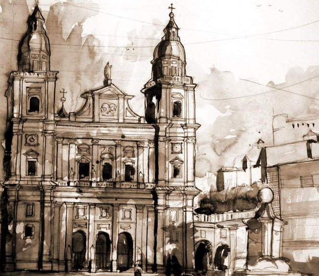 Salzburger Barock aus|gezeichnetHenner Herrmanns Eine Gruppe von Architekturstudenten/innen (unter der Leitung von Prof. Henner Herrmanns) erkundete Mitte Mai 2012 Salzburg mit dem Ziel, die dortige sakrale Architektur hinsichtlich ihrer Elemente, ihres Reliefs und ihrer Proportionen mit Hilfe des Zeichenstiftes zu erfassen. Schon Mozarts Zeitgenosse Johann Kaspar Riesbeck schrieb über das barocke Juwel: „Alles atmet hier den Geist des Vergnügens und der Lust [ ] und ich habe noch keinen Ort gesehen, wo man so viel Sinnliches genießen kann.“ Tatsächlich zeigte sich die Mozart-Stadt von ihrer schönsten Seite: Auf Schritt und Tritt begegnen dem Besucher barocke Kirchen. Will man diese erfassen, bietet sich die Skizze zur Erschließung und Analyse an. Mit Bildern lässt sich besser denken und verstehen als nur mit Worten. Zeichnen ermöglicht Sehen und Erkennen. Es hat viel Spaß gemacht, Pomp und Theater der barocken Bauwerke wie Dom, Dreifaltigkeitskirche, St. Sebastian u. a. mit Hilfe von Bleistift und Papier zu erfassen.